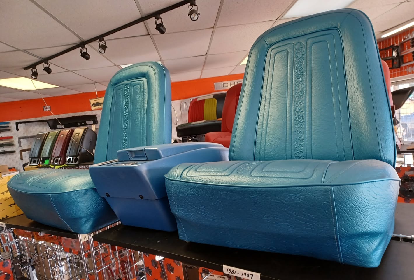 Fresh in stock and ready to roll — restored genuine GM C10 bucket seats in that beautiful ’69/’70 bright blue with the correct scroll pattern. They’re priced at $4850 for the set, and you can pick them up right here in Arlington, Texas. If you’re out of state or overseas, no worries — worldwide shipping is available. These don’t sit long, so grab ’em while you can!